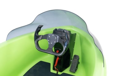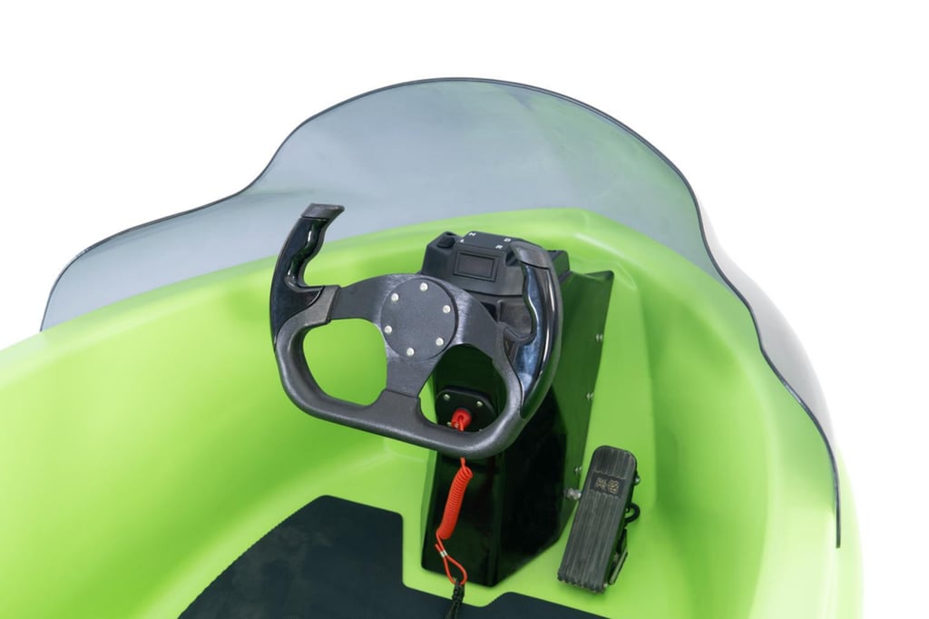 Everything you need, nothing you don’t. Left handle controls speed, right handle manages forward and reverse, with a central safety cord for protection. Paired with a steering wheel and throttle, the layout is clean, intuitive, and easy to master—perfect for riders of all experience levels.